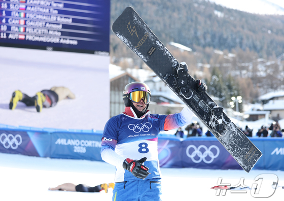 스노보드 김상겸이 8일(현지시간) 이탈리아 리비뇨의 스노파크에서열린 2026 밀라노·코르티나담페초 동계올림픽 스노보드 남자 평행 대회전 준결승에서 결승 진출을 확정지은 뒤 기뻐하고 있다. 2026.2.8 © 뉴스1 김진환 기자