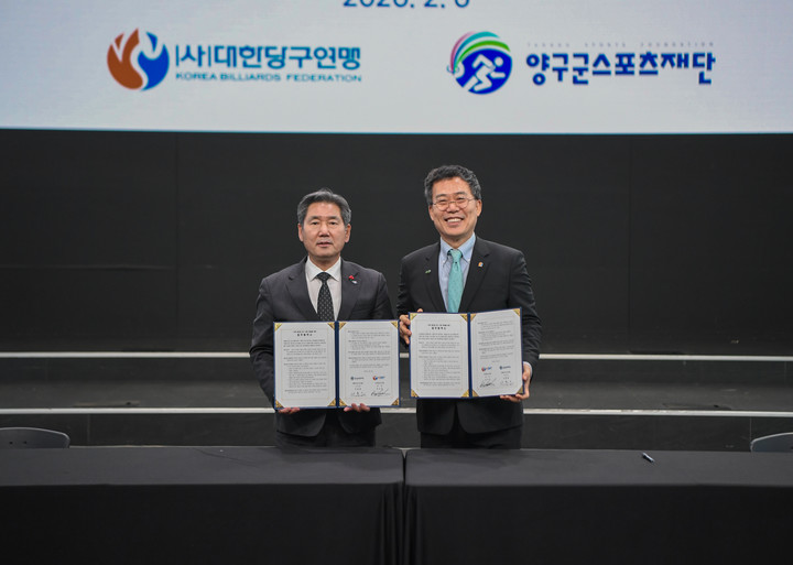 이번 협약식에는 대한당구연맹 서수길 회장과 양구군스포츠재단 서흥원 이사장이 참석했다.