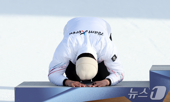 스노보드 남자 평행 대회전에서 값진 은메달을 획득한 김상겸이 8일(현지시간) 이탈리아 리비뇨의 스노파크에서 열린 2026 밀라노·코르티나담페초 동계올림픽 스노보드 남자 평행 대회전 시상식에서 큰절을 하고 있다. 2026.2.8 © 뉴스1 김진환 기자