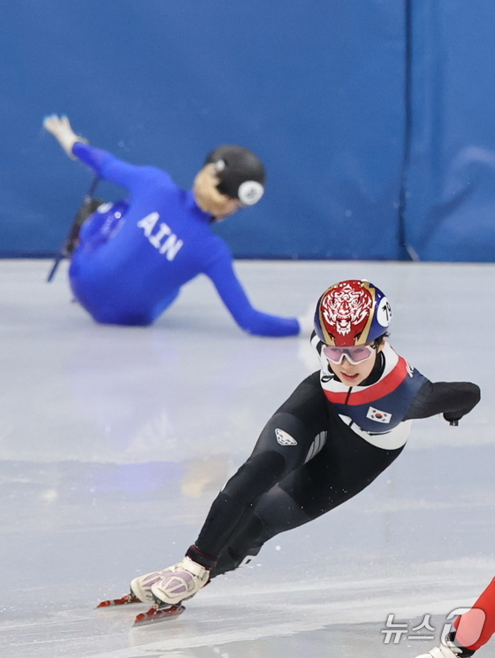 쇼트트랙 대표팀 이소연이 10일(현지시간) 이탈리아 밀라노 아이스 스케이팅 아레나에서 열린 2026 밀라노·코르티나담페초 동계올림픽 쇼트트랙 여자 500m 예선에서 역주하고 있다. © 뉴스1 김진환 기자