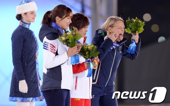 박승희와 함께 시상대에 서 있는 폰타나(오른쪽)2014.2.14 © 뉴스1