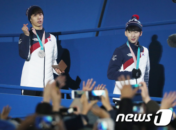 2018 평창 동계 올림픽 쇼트트랙 남자 500m에서 은메달을 획득한 황대헌(왼쪽)과 동메달을 딴 임효준. 2018.2.23 © 뉴스1 이재명 기자