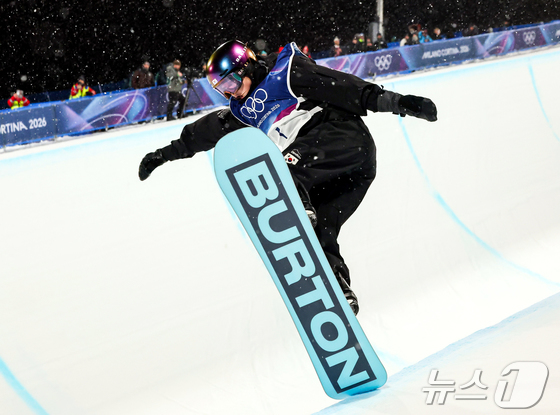 스노보드 최가온이 12일(현지시간) 이탈리아 리비뇨 스노파크에서 열린 2026 밀라노·코르티나담페초 동계올림픽 스노보드 여자 하프파이프 결선 1차전 경기를 펼치고 있다. 이날 최가온은 1,2차 경기에서 넘어진 후 3차 시기에 90.25점을 받아 단독 1위에 올라서 금메달을 획득했다. 2026.2.13 © 뉴스1 김진환 기자
