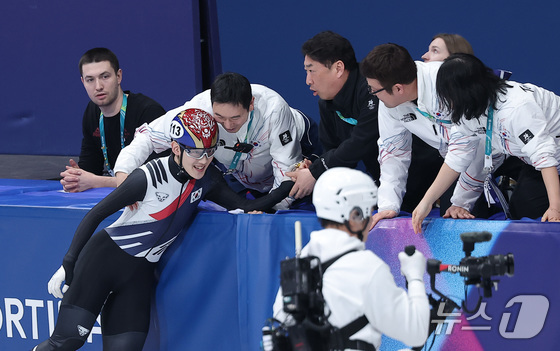 쇼트트랙 임종언이 12일(현지시간) 이탈리아 밀라노 아이스 스케이팅 아레나에서 열린 2026 밀라노·코르티나담페초 동계올림픽 쇼트트랙 남자 1000m 결승에서 동메달을 확보한 후 코칭 스태프와 기뻐하고 있다. 2026.2.13 © 뉴스1 김성진 기자