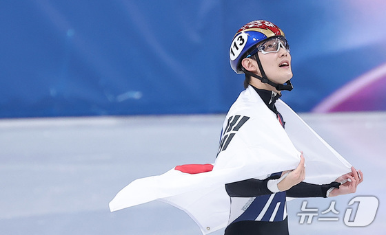 쇼트트랙 임종언이 12일(현지시간) 이탈리아 밀라노 아이스 스케이팅 아레나에서 열린 2026 밀라노·코르티나담페초 동계올림픽 쇼트트랙 남자 1000m 결승에서 동메달을 확보한 후 태극기를 두르고 기뻐하고 있다. 2026.2.13 © 뉴스1 김성진 기자