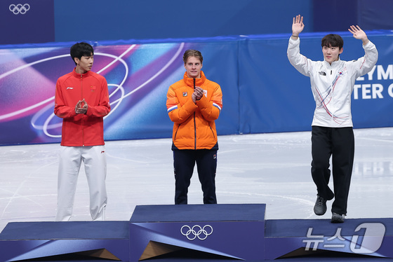 쇼트트랙 남자 1000m에서 동메달을 획득한 임종언이 12일(현지시간) 이탈리아 밀라노 아이스 스케이팅 아레나에서 열린 2026 밀라노·코르티나담페초 동계올림픽 쇼트트랙 남자 1000m 시상식에서 네덜란드 옌스 판트 바우트, 중국 쑨룽과 기념촬영을 하고 있다. 2026.2.13 © 뉴스1 김성진 기자