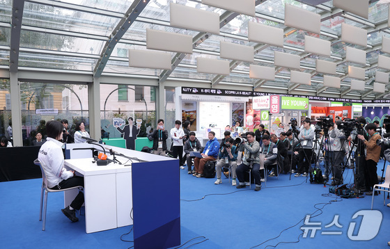 스노보드 여자 하프파이프에서 금메달을 차지한 최가온이 14일(현지시간) 이탈리아 밀라노의 빌라 네키 캄필리오(Villa Necchi Campiglio)에 마련된 코리아하우스에서 열린 기자회견에서 취재진의 질문에 답하고 있다. 2026.2.14 © 뉴스1 김성진 기자