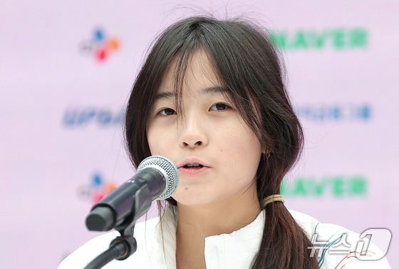 스노보드 여자 하프파이프에서 금메달을 차지한 최가온이 14일(현지시간) 이탈리아 밀라노의 빌라 네키 캄필리오(Villa Necchi Campiglio)에 마련된 코리아하우스에서 열린 기자회견에 참석하고 있다. 2026.2.14 © 뉴스1 김성진 기자