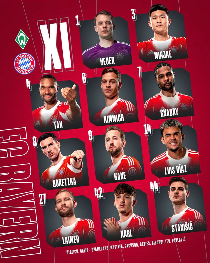 이날 뮌헨은 해리 케인과 루이스 디아스, 세르쥬 나브리, 레나르트 칼, 레온 고레츠카, 조슈아 키미히, 콘라드 라이머, 조나단 타, 김민재, 요시프 스타니시치, 골키퍼 마누엘 노이어가 선발했다.