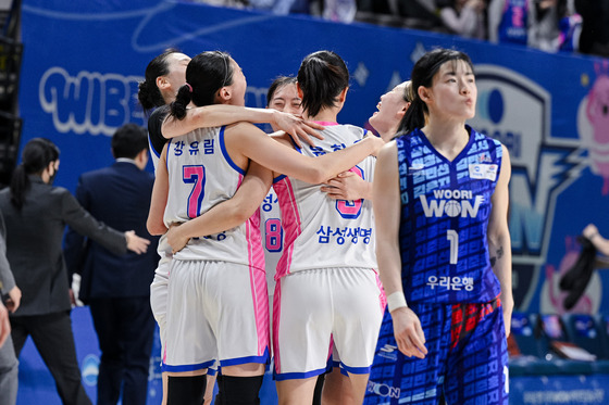 용인 삼성생명 선수들이 15일 충남 아산이순신체육관에서 열린 2025-26 여자프로농구 아산 우리은행전에서 58-56로 승리한 뒤 기뻐하고 있다. (WKBL 제공)
