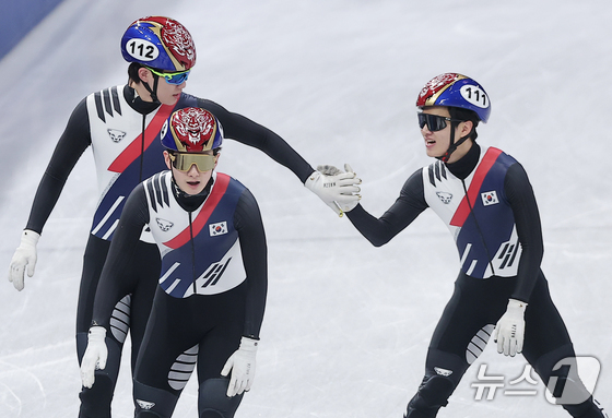 쇼트트랙 이정민(111)과 이준서(112)가 16일(현지시간) 이탈리아 밀라노 아이스스케이팅 아레나에서 열린 2026 밀라노·코르티나담페초 동계올림픽 쇼트트랙 남자 5000m 계주 준결승에서 결승을 확정지은 뒤 기뻐하고 있다. 2026.2.16 © 뉴스1 김성진 기자