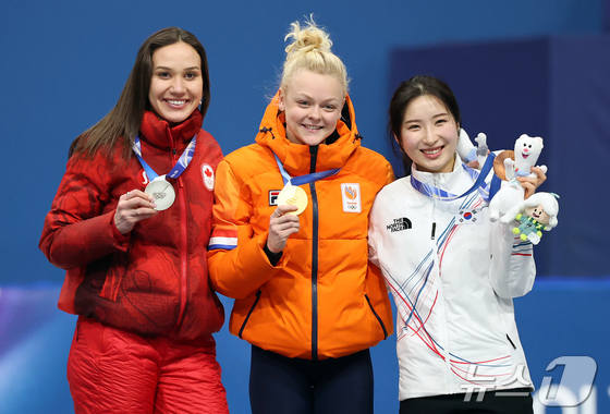 쇼트트랙 김길리가 16일(현지시간) 이탈리아 밀라노 아이스스케이팅 아레나에서 열린 2026 밀라노·코르티나담페초 동계올림픽 쇼트트랙 여자 1000m 시상식에서 금메달리스트 네덜란드 산드라 벨제부르와 은메달리스트 코트니 사로와 기념 촬영을 하고 있다. 2026.2.16 © 뉴스1 김진환 기자