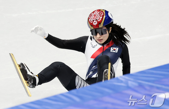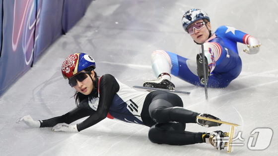 쇼트트랙 김길리가 16일(현지시간) 이탈리아 밀라노 아이스스케이팅 아레나에서 열린 2026 밀라노·코르티나담페초 동계올림픽 쇼트트랙 여자 1000m 준결승에서 벨기에 하너 데스머트의 반칙으로 인해 넘어지고 있다. 이날 김길리는 어드밴스로 결승에 진출했다. 2026.2.16 © 뉴스1 김성진 기자