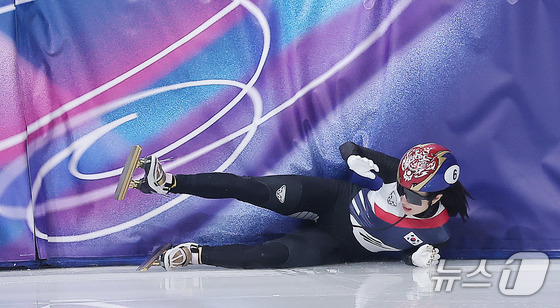 쇼트트랙 대표팀 김길리가 10일(현지시간) 이탈리아 밀라노 아이스 스케이팅 아레나에서 열린 혼성 2,000m 계주 준결승에서 넘어지고 있다. 2026.2.10 © 뉴스1 김진환 기자