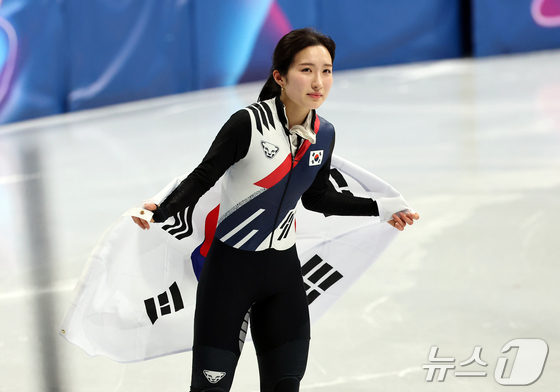 쇼트트랙 김길리가 16일(현지시간) 이탈리아 밀라노 아이스스케이팅 아레나에서 열린 2026 밀라노·코르티나담페초 동계올림픽 쇼트트랙 여자 1000m 결승에서 동메달을 확정 지은 뒤 태극기를 두르며 인사하고 있다. 2026.2.16 © 뉴스1 김진환 기자