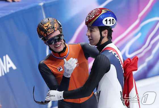쇼트트랙 황대헌이 14일(현지시간) 이탈리아 밀라노 아이스스케이팅 아레나에서 열린 2026 밀라노·코르티나담페초 동계올림픽 쇼트트랙 남자 1500m 결승에서 은메달을 확보한 후 금메달을 획득한 네덜란드 옌스 판트 바우트와 포옹하고 있다. 2026.2.15 © 뉴스1 김성진 기자