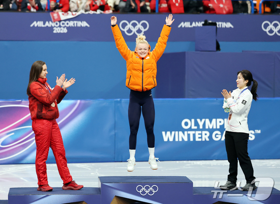 2026 밀라노·코르티나담페초 동계올림픽 쇼트트랙 여자 1000m에서 금메달을 획득한 네덜란드 쇼트트랙의 산드라 벨제부르가 16일(현지시간) 이탈리아 밀라노 아이스스케이팅 아레나에서 열린 시상식에서 환호하고 있다. 2026.2.16 © 뉴스1 김진환 기자