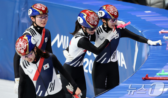 준결선 진출 후 기뻐하는 한국 여자 쇼트트랙 대표팀. 2026.2.15 © 뉴스1 김진환 기자