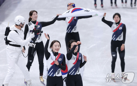 대한민국 여자 쇼트트랙 대표팀이 18일(현지시간) 이탈리아 밀라노 아이스스케이팅 아레나에서 열린 2026 밀라노·코르티나담페초 동계올림픽 쇼트트랙 여자 3000m 계주 결승에서 금메달을 차지한 후 태극기를 두르고 관중석을 향해 인사하고 있다. 2026.2.19 © 뉴스1 김성진 기자