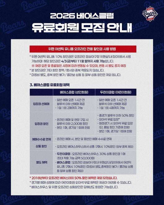 2026시즌 유료회원은 성인 대상의 '베어스클럽' 8,000명, 만 14세 이하(2012년 이후 출생자) 어린이 대상의 '두린이클럽' 2,000명을 각각 선착순 모집한다.