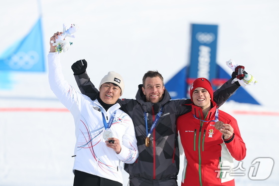 스노보드 남자 평행 대회전 은메달을 확보한 김상겸이 8일(현지시간) 이탈리아 리비뇨의 스노파크에서 열린 2026 밀라노·코르티나담페초 동계올림픽 스노보드 남자 평행 대회전 시상식에서 기뻐하고 있다. 왼쪽부터 김상겸, 베냐민 카를(오스트리아), 테르벨 잠피로프(불가리아). 2026.2.8 © 뉴스1 김진환 기자