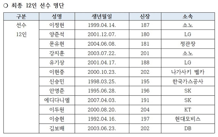 지난 19일 송교창(KCC)이 발목 부상으로 대표팀 명단에서 제외되고 안영준(SK)이 합류한 데 이어 대표팀 소집 직전 이원석(삼성)이 발목 인대 부상으로 빠지고 이두원(KT)가 대체 발탁됐다.