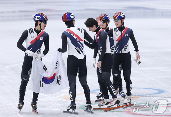 쇼트트랙 남자 대표팀이 20일(현지시간) 이탈리아 밀라노 아이스 스케이팅 아레나에서 열린 2026 밀라노·코르티나담페초 동계올림픽 쇼트트랙 남자 5000m 계주 결승에서 은메달을 확보한 후 하이파이브를 하고 있다. 2026.2.21 © 뉴스1 김성진 기자