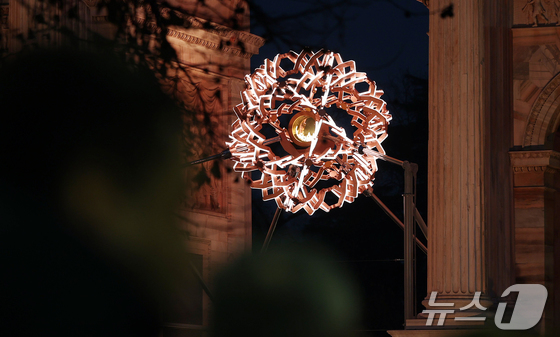 7일(현지시간) 오후 이탈리아 밀라노 '평화의 아치'(아르코 델라 파체·Arco della Pace) 성화대에 점화된 성화가 불타고 있다. 2026.2.8 © 뉴스1 김진환 기자