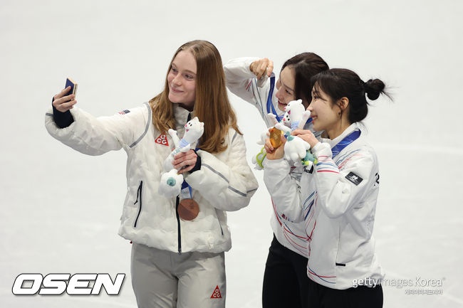 결승선을 통과한 스토더드는 믿을 수 없다는 표정으로 동료들과 기쁨을 나눴다. 포디움에 오른 뒤엔 김길리 옆에서 폴짝 뛰어오르기도 했다. 함께 시상대에 선 김길리, 최민정과 기념사진도 남겼다.