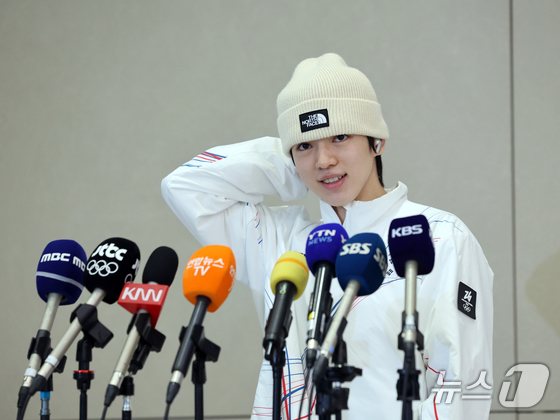 2026 밀라노·코르티나담페초 동계올림픽 피겨스케이팅 남자 싱글에서 4위를 차지한 차준환이 23일 오후 인천공항을 통해 입국, 취재진 질문에 답하고 있다. 2026.2.23 © 뉴스1 황기선 기자