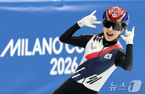 쇼트트랙 김길리가 20일(현지시간) 이탈리아 밀라노 아이스 스케이팅 아레나에서 열린 2026 밀라노·코르티나담페초 동계올림픽 쇼트트랙 여자 1500m 결승에서 금메달을 확보한 후 환호하고 있다. 2026.2.21 © 뉴스1 김진환 기자