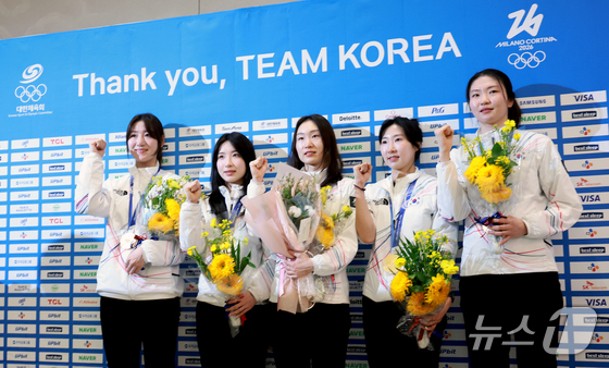 쇼트트랙 여자 3,000m 계주 금메달리스트인 노도희(왼쪽부터), 김길리, 최민정, 이소연, 심석희가 24일 인천국제공항 제2여객터미널에서 2026 밀라노-코르티나담페초 동계올림픽을 마치고 귀국해 기념촬영을 하고 있다. 대한민국은 2026 밀라노·코르티나담페초 동계올림픽에서 총 10개의 메달(금 3, 은 4, 동 3)과 종합순위 13위를 기록했다. 2026.2.24 © 뉴스1 이호윤 기자