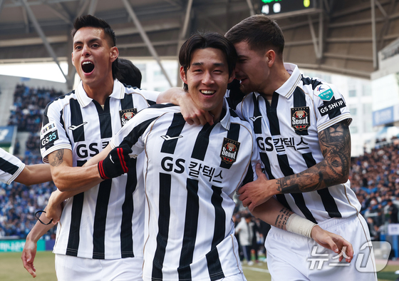 28일 오후 인천시 중구 인천축구전용경기장에서 열린 하나은행 K리그1 2026 공식 개막전 인천 유나이티드와 FC서울의 경기 후반전에서 FC서울 송민규가 선제골을 넣은 뒤 동료들과 기뻐하고 있다. 2026.2.28 © 뉴스1 김민지 기자
