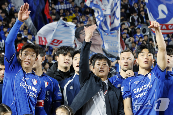 28일 오후 경기도 수원시 팔달구 월드컵로 수원월드컵경기장에서 열린 하나은행 K리그2 2026 1라운드 수원삼성과 서울이랜드의 경기에서 2대 1 역전승을 거둔 수원삼성 이정효 감독과 주장 홍정호 등이 역전골의 주인공 강현묵을 향해 빨리 올 것을 요구하고 있다. 2026.2.28 © 뉴스1 박정호 기자