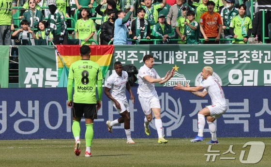 1일 전북 전주시 전주월드컵경기장에서 열린 하나은행 K리그1 2026 전북현대와 부천FC의 경기에서 부천FC 갈레고가 골을 넣고 동료들과 기쁨을 나누고 있다. 2026.3.1 © 뉴스1 유경석 기자