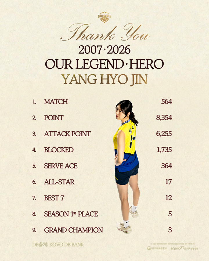 구단 측은 "양효진 선수가 팀에 남긴 족적은 그 무엇과도 비교할 수 없을 만큼 값지다”며, “그의 헌신에 걸맞은 최고의 예우로 마지막 길을 배웅할 계획"이라고 전혔다.