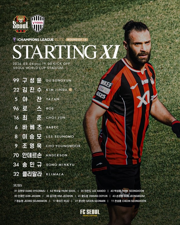이날 서울은 클리말라와 안데르손, 송민규, 조영욱, 이승모, 바베츠, 김진수, 로스, 야잔, 최준, 골키퍼 구성윤이 선발 출격했다.