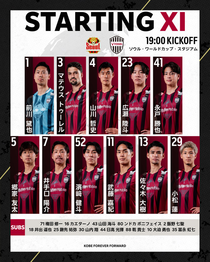 고베는 코마츠 렌, 무토 요시노리, 다이쥬 사사키, 하마사키 켄토, 고케 유타, 이데구치 요스케, 카츠야 나가토, 리쿠토 히로세, 야마가와 테츠키, 마테우스 툴레르, 골키퍼 마에카와 다이야가 선발 명단에 이름을 올렸다.