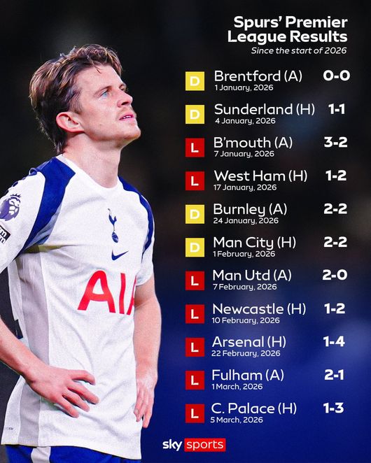 토트넘은 같은 날 영국 런던의 토트넘 홋스퍼 스타디움에서 열린 2025-2026 프리미어리그 29라운드 홈 경기에서 크리스탈 팰리스에 1-3으로 완패했다.