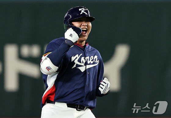 7일 오후 일본 도쿄돔에서 열린 2026 월드베이스볼클래식 C조 조별리그 대한민국과 일본의 경기. 대한민국 문보경이 1회초 2사 1,2루때 2타점 2루타를 친 뒤 포효하고 있다. © 뉴스1 구윤성 기자