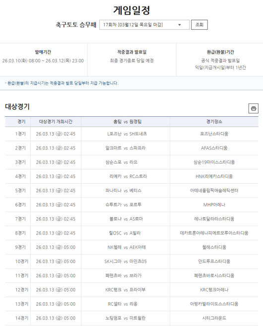 한편, 축구토토 승무패 17회차는 3월 10일(화) 오전 8시부터 발매를 개시해 12일(목) 오후 11시까지 구매할 수 있다.