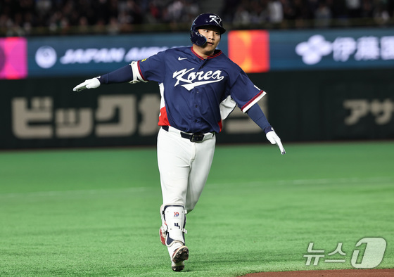 9일 일본 도쿄돔에서 열린 2026 월드베이스볼클래식 조별리그 C조 대한민국과 호주의 경기. 대한민국 문보경이 2회초 무사 1루 투런홈런을 친 뒤 그라운드를 돌고 있다. 2026.3.9 © 뉴스1 구윤성 기자