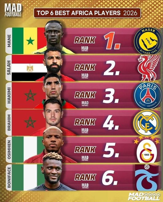 한편 아프리카 대륙에서는 여러 국적의 선수들이 랭킹에 포함됐다. 카메룬의 사디오 마네(알 나스르)를 시작으로 모하메드 살라(이집트·리버풀), 아슈라프 하키미(파리 생제르맹), 브라힘 디아스(이상 모로코·레알 마드리드), 빅터 오시멘(갈라타사라이), 빅터 보니페이스(이상 나이지리아·트라브존스포르)가 이름을 올렸다.