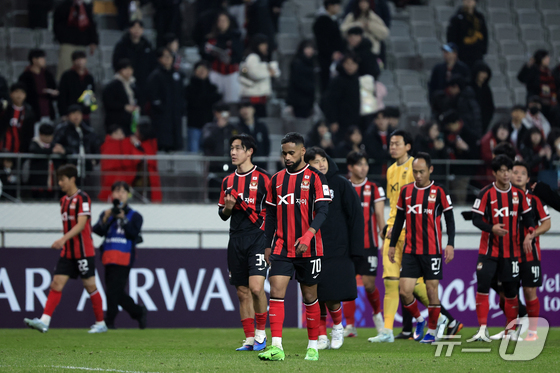 4일 오후 서울시 마포구 월드컵로 서울월드컵경기장에서 열린 아시아축구연맹(AFC) 챔피언스리그 엘리트(ACLE) 16강 1차전 FC서울과 비셀 고베의 경기에서 1대 0으로 패한 FC서울 선수들이 착잡한 모습으로 서포터즈에게 향하고 있다. 2026.3.4 © 뉴스1 박정호 기자