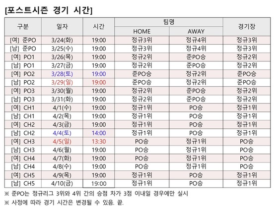 준PO 승자는 생존, 정규리그 2위와 PO를 치른다. 여자부는 26일, 남자부는 27일부터 진행되며 3전 2승제로 열린다.