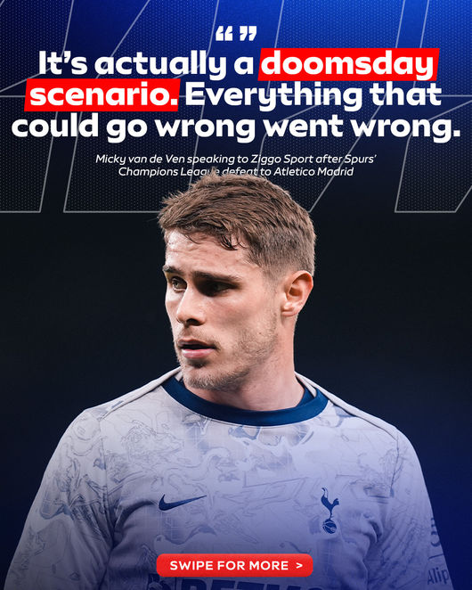 영국 'BBC'는 12일(이하 한국시간) "반 더 벤은 토트넘의 연패 상황에 한숨을 쉬었다. 그는 팀이 '종말 같은 시나리오(Doomsday scenario)'에 빠졌다며 계속해서 타격을 받고 있다고 토로했다"라고 보도했다.