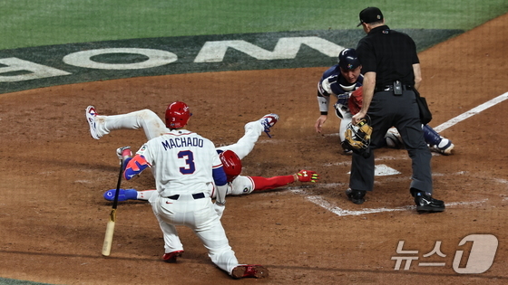 13일 오후(현지시간) 미국 플로리다주 마이애미 론디포파크에서 열린 2026 월드베이스볼클래식(WBC) 8강전 대한민국과 도미니카공화국의 경기. 도미니카 공화국 후안 소토가 3회말 무사 1루 상황에서 블라디미르 게레로 주니어의 안타 때 홈으로 쇄도해 세이프 되고 있다. 2026.3.14 © 뉴스1 구윤성 기자