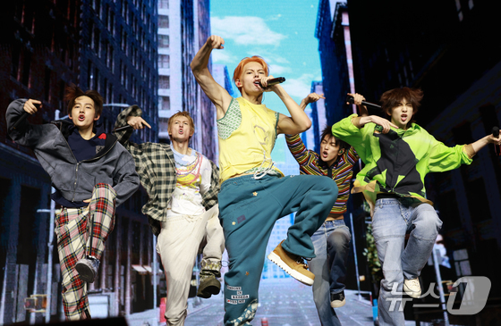 보이그룹 코르티스(CORTIS)가 18일 서울 용산구 블루스퀘어에서 가진 데뷔 앨범 ‘컬러 아웃사이드 더 라인즈(COLOR OUTSIDE THE LINES)’ 쇼케이스에서 신곡을 선보이고 있다. 2025.8.18 © 뉴스1 권현진 기자