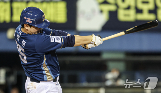 24일 오후 서울 송파구 잠실야구장에서 열린 프로야구 '2024 신한 SOL 뱅크 KBO리그' NC 다이노스와 두산 베어스의 경기, 6회초 2사 2루 상황에서 NC 김형준이 1타점 적시타를 치고 있다. 2024.9.24 © 뉴스1 김도우 기자