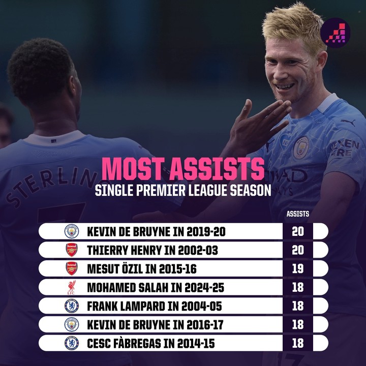 매체에 따르면, 단일 시즌 최다 도움 기록은 20개로 현재 아스널의 전설적인 스트라이커 티에리 앙리와 맨체스터 시티의 레전드 케빈 더 브라위너(나폴리)가 보유하고 있다. 앙리는 2002-03시즌, 더 브라위너는 2019-20시즌에 각각 달성하며 이 부문 최다 기록을 공동으로 보유하고 있다.